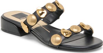 Oversized studs designed with mixed textures and gilded shimmer brighten the straps bridging a sandal styled with a low profile that keeps the spotlight on the hardware. Just step in and get going every time you want to give a sunny-day look an even sunnier personality.
