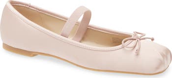 Channel your inner ballerina by donning this satin flat framed by a darling bow and squared, gathered toe.