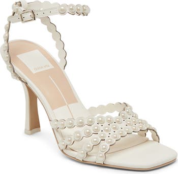 Pearly beads accentuate the scalloped straps of a lofty ankle-strap sandal that's ready for your next special occasion.