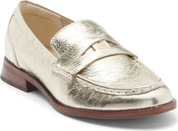 An almond toe and stacked heel shape this metallic leather loafer topped with a modernized penny keeper strap.