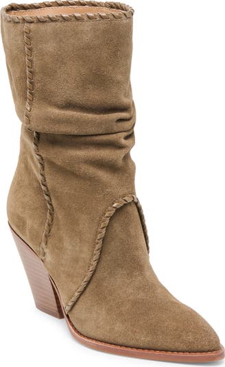 Bold whipstitching and an elongated pointy toe emphasize the Western inspiration of this rich suede boot featuring a slouchy ruched shaft.
