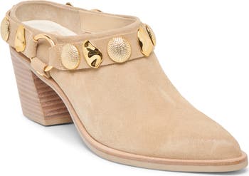 Hitting the sweet spot between a Western bootie and a standout step-in, this pointy-toe mule pairs the texture of hairy suede with the shimmer of a brightly studded harness. The stacked heel gives it an added kick that elevates your stature as you relax your favorite looks.