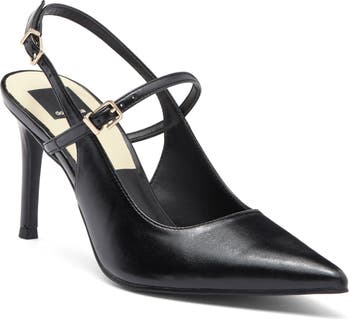 Subtle cutouts lend airy structure to this leather slingback pump fronted by a pointy toe and balanced on a stiletto heel.