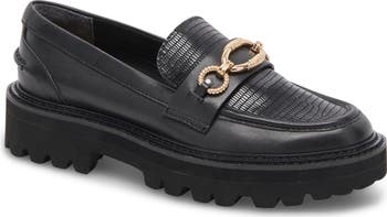 Luminous and texture goldtone links embellish the strap of a luxe leather loafer crafted with a sueded inside heel and a chunky lugged sole.