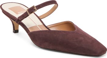 An adjustable mary jane strap offers a secure fit and retro aesthetic on a streamlined mule featuring a snip toe and tapered heel for striking balance.