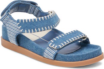 Elevate your weekend ensembles with this denim sandal secured with adjustable hook-and-loop straps and lofted by a wedge heel.