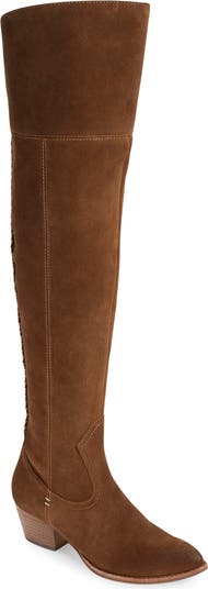 A whipstitched back panel adds to the Western-inspired appeal of a standout over-the-knee boot cut from weathered suede and detailed with a svelte almond toe. A stacked block heel adds just-right height.