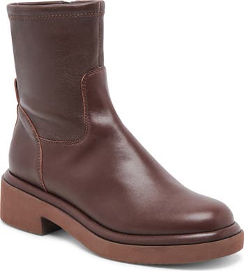 A stretchy shaft and side zipper offer easy wear on a waterproof leather bootie lifted by a subtle platform and chunky block heel.