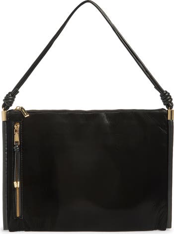 A slim yet spacious shoulder bag features a sleek zip pocket and knotted shoulder strap.