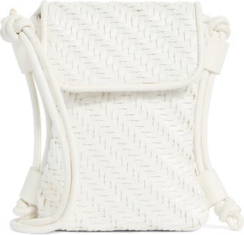 A woven design enriches this compact crossbody bag featuring knotted, adjustable straps for easy carrying.