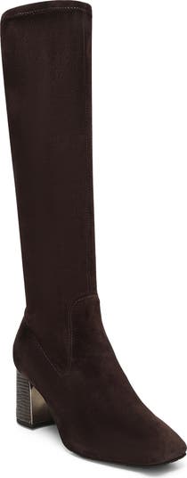 A croc-embossed block heel and square toe elevate a contemporary boot styled in a knee-high silhouette with a supple suede upper.