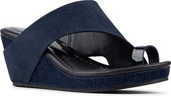 Stroll through sunny days in this lightly cushioned wedge sandal secured by a glossy toe loop and sculptural suede strap.