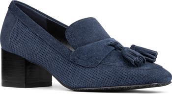 Elevate your look with a tassel-embellished loafer-pump fashioned with an apron-stitched toe and chunky block heel.