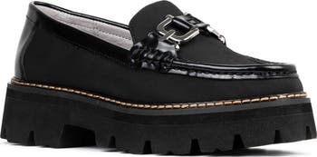 Polished bit hardware and a moc toe add visual intrigue to a mixed-media loafer elevated by a chunky platform and heavily lugged sole.