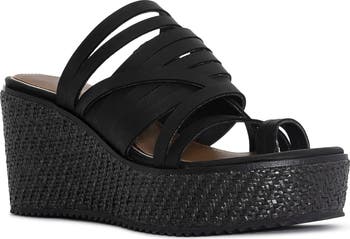 A woven wedge heel adds an espadrille-inspired element to a strappy toe-loop sandal complete with comfort-enhancing memory foam cushioning.