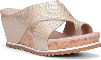Foam cushioning comfortably grounds you in this wedge sandal featuring overlapping leather straps.