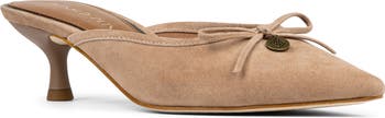 Experience plush comfort with every step you take in this memory-foam padded mule framed with a bow-accented pointy toe and sculptural kitten heel.