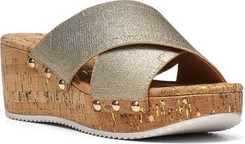 Lightweight cork offers a comfortable lift to a wedge sandal secured with elastic banded straps.