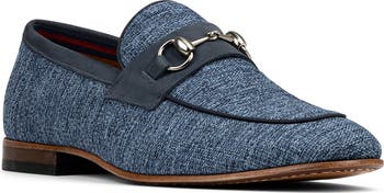 Burnished bit hardware distinguishes a woven loafer trimmed in rich leather and grounded by a cushioned footbed for comfortable wear.