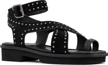 Flashy studs intensify the modern edge of an outfit-making sandal featuring wide straps, a toe loop detail and comfort-enhancing memory foam cushioning.