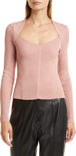 An elegant Queen Anne neckline shapes a soft pullover sweater knit in a fine-gauge rib stitch.
