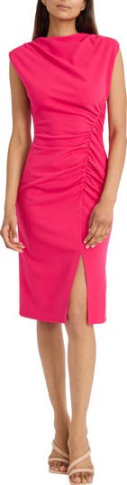 A draped cowl neck and asymmetric ruching define this sleeveless midi dress cut from comfortable stretch fabric in a figure-skimming silhouette.
