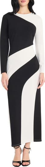 A swirling colorblock design emboldens this chic long-sleeve maxi dress cut from a stretchy scuba knit in a figure-skimming silhouette.