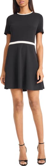 Contrasting trim along the neckline and waist adds a preppy touch to this mini cut in a flowy A-line silhouette.
