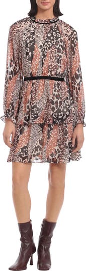 Easily transition from desk to dinner in this mini styled with animal spots, a slender waist belt and long sleeves.