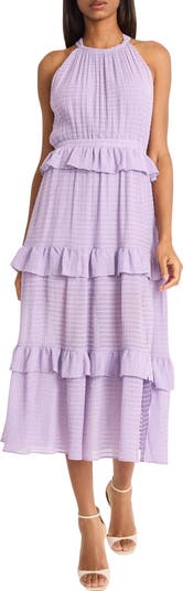 Fluttery ruffles enhance the whimsical appeal of a sleeveless midi dress framed by a halter neck and gracefully tiered skirt.