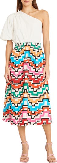 A folksy artisan-style printed skirt brings an elevated finish to a midi dress featuring one short bubble hem sleeve.
