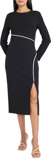 Stark piped trim wraps around the waist and down to the front slit of this contemporary sheath framed with long sleeves and a jewel neckline.