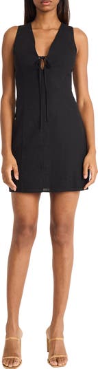 A plunging neckline and tie keyhole bring a sultry touch to an airy linen-blend sheath dress that's perfect for a day or night out.