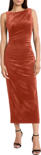Make a stunning appearance in this sleeveless velvet midi dress framed by elegant ruching and an alluring side slit.