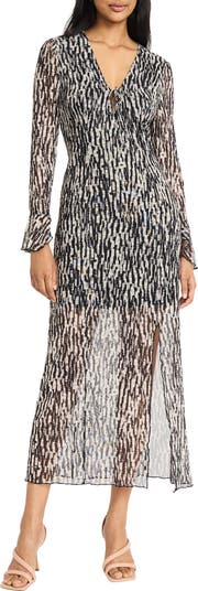 A front slit lets you stride smoothly through your off-duty day in this sheath dress framed with long sleeves and a V-neckline.