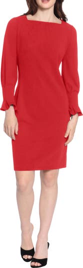 An elegant square neck sheath dress features long sleeves with pleated cuffs for sophisticated style.