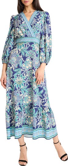 Billowy balloon sleeves frame this wrap-front maxi made with a swirling bloom print and outlined with contrasting borders.