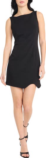 A curve at the hem brings shoes off an extra peekaboo of leg in this mini sheath dress that's the perfect addition to your LBD collection.