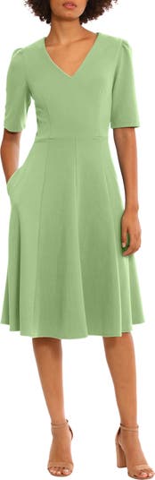 A figure flattering fit and flare silhouette makes this elbow sleeve dress a must-have addition to your wardrobe, finished off with a sleek V-neckline.