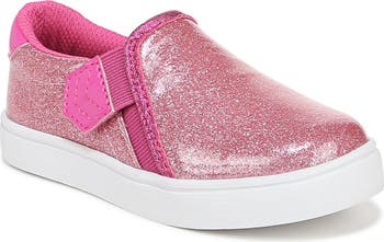 Lightweight and flexible soles support a well-cushioned sneaker featuring a sparkling glitter finish for a pretty finish.