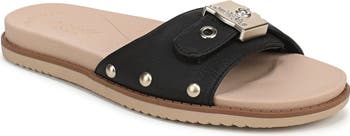 Glossy hardware and a well-cushioned footbed deliver street-savvy style to this casual slide sandal.