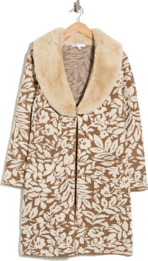 Free-spirited and cozy, this floral jacquard coatigan is framed by a fluffy faux fur collar.