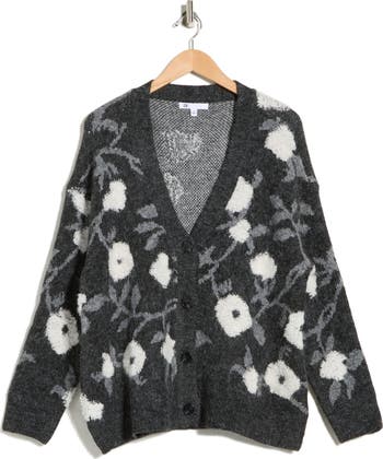Textured jacquard flowers sweeten a soft double-knit cardigan fashioned in a slouchy silhouette for ultracozy style.