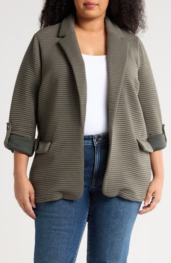 - - Approx. 32" length - Notch lapel - Three quarter sleeves with roll-up button tabs - Open front - 2 front flap-welt pockets - Stripe print - Imported