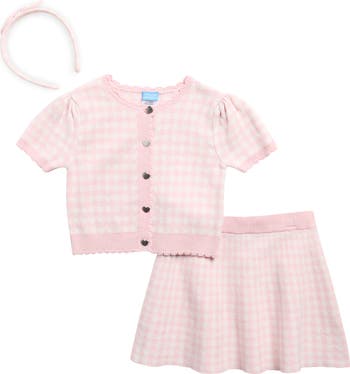 Perfect for school or playdates, this sweet gingham outfit features a button-up sweater, skirt and a matching bow headband.