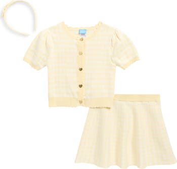 Perfect for school or playdates, this sweet gingham outfit features a button-up sweater, skirt and a matching bow headband.