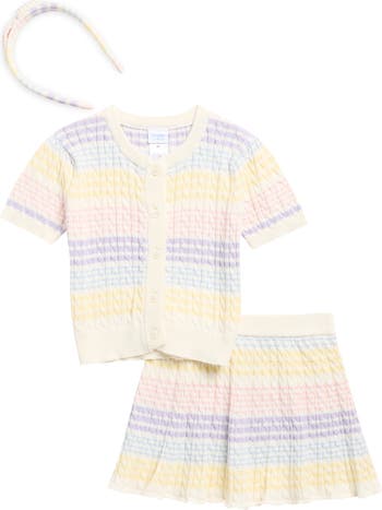 Pretty pastel colors stripe a soft cable-knit sweater and matching skirt set that will give your kid a complete coordinated look down to a matching headband.