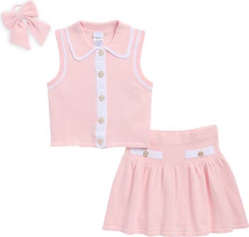 Refresh your kiddo's wardrobe with this preppy cotton-knit set featuring a tipped sweater-vest, skirt and a bow hair elastic.