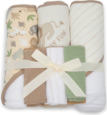 Keep them dry and cozy after bath time with this set that features three hooded towels and three washclothes in an assortment of colors and prints.