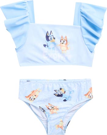 Make their next beach day extra fun with this frilly-trimmed two-piece swimsuit featuring their favorite cartoon pup, Bluey.